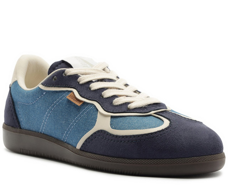 Tênis A'25 Azul. De solado baixo emborrachado em goma nude vulcanizada, o modelo apresenta cabedal com mix de materiais: tecido de nylon e camurça. Traz novidade na construção - detalhe de costura pesponto imponente nas laterais e contornos, com design de recortes modernos e ondulados com peças em azul contrastante, aplicadas na biqueira, na parte traseira e na lingueta. De amarrar, com atacadores brancos, possui parte interna forrada em branco. Com tag lateral marrom Anacapri.