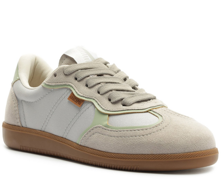 Tênis A'25 Cinza e Verde. De solado baixo emborrachado em goma nude vulcanizada, o modelo apresenta cabedal com mix de materiais: tecido de nylon e camurça. Traz novidade na construção - detalhe de costura pesponto imponente nas laterais e contornos, com design de recortes modernos e ondulados com peças em verde contrastante, aplicadas na biqueira, na parte traseira e na lingueta. De amarrar, com atacadores cinzas, possui parte interna forrada em branco. Com tag lateral marrom Anacapri.