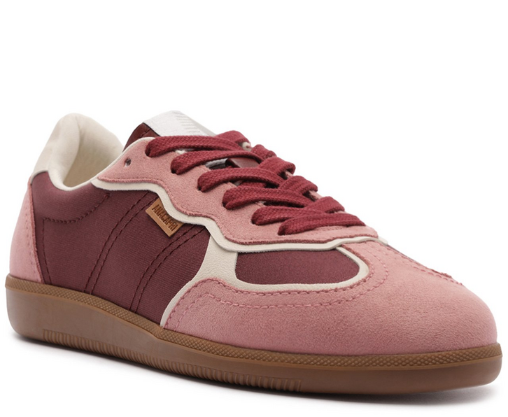Tênis A'25 Lilás. De solado baixo emborrachado em goma nude vulcanizada, o modelo apresenta cabedal com mix de materiais: tecido de nylon e camurça. Traz novidade na construção - detalhe de costura pesponto imponente nas laterais e contornos, com design de recortes modernos e ondulados com peças em marrom contrastante, aplicadas na biqueira, na parte traseira e na lingueta. De amarrar, com atacadores brancos, possui parte interna forrada em marrom. Com tag lateral marrom Anacapri. O tênis traz a nova etiqueta tecida Anacapri aplicada na lingueta: branca, com design moderno e urbano, o modelo A'25 - nome que leva o ano de lançamento.