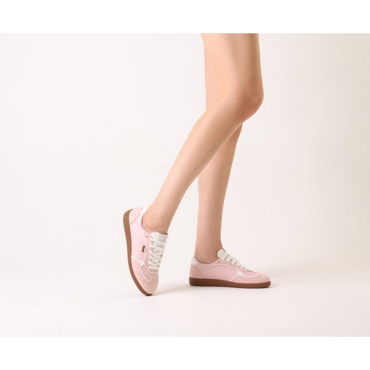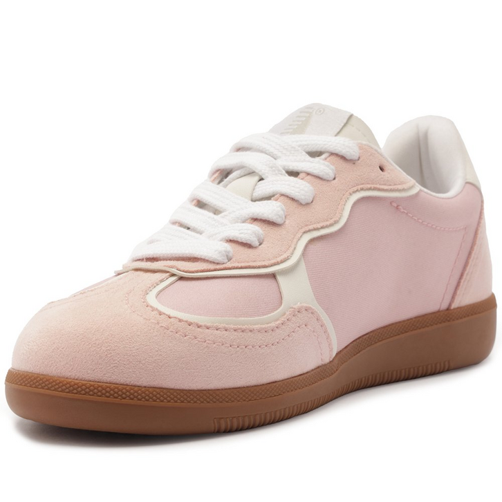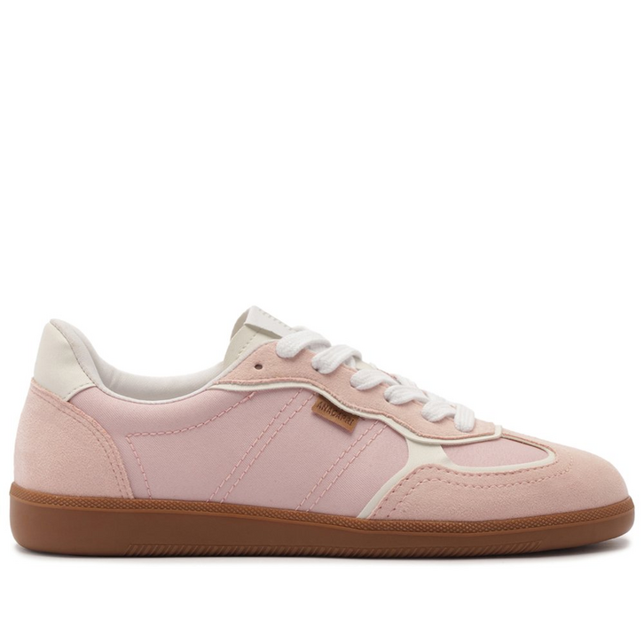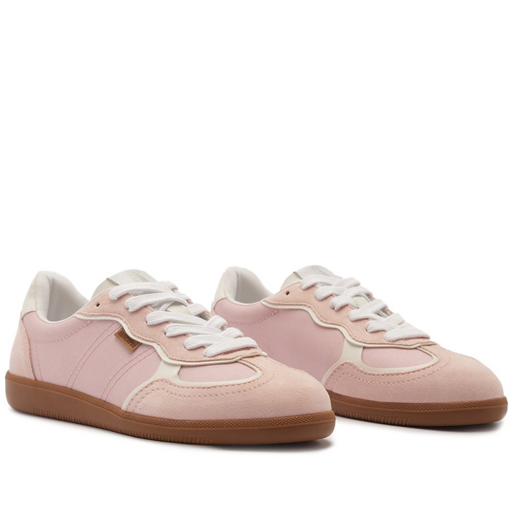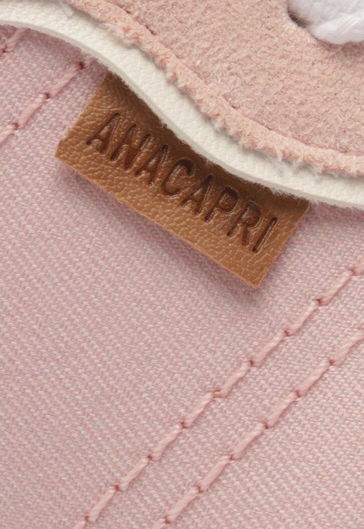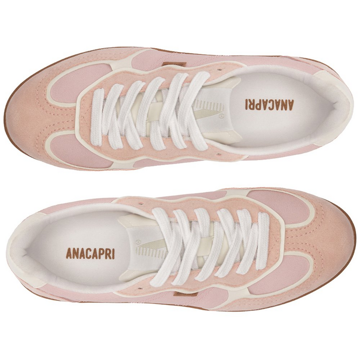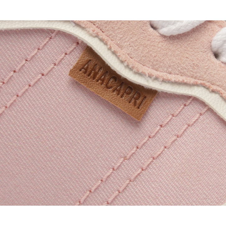 Tênis A'25 Rosa Bebê. De solado baixo emborrachado em goma nude vulcanizada, o modelo apresenta cabedal com mix de materiais: tecido de nylon e camurça. Traz novidade na construção - detalhe de costura pesponto imponente nas laterais e contornos, com design de recortes modernos e ondulados com peças em rosa contrastante, aplicadas na biqueira, na parte traseira e na lingueta. De amarrar, com atacadores brancos, possui parte interna forrada em branco. Com tag lateral marrom Anacapri. O tênis traz a nova etiqueta tecida Anacapri aplicada na lingueta: branca, com design moderno e urbano, o modelo A'25 - nome que leva o ano de lançamento.