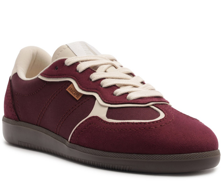 Tênis A'25 Roxo. De solado baixo emborrachado em goma nude vulcanizada, o modelo apresenta cabedal com mix de materiais: tecido de nylon e camurça. Traz novidade na construção - detalhe de costura pesponto imponente nas laterais e contornos, com design de recortes modernos e ondulados com peças em marrom contrastante, aplicadas na biqueira, na parte traseira e na lingueta. De amarrar, com atacadores brancos, possui parte interna forrada em marrom. Com tag lateral marrom Anacapri. O tênis traz a nova etiqueta tecida Anacapri aplicada na lingueta: branca, com design moderno e urbano, o modelo A'25 - nome que leva o ano de lançamento.