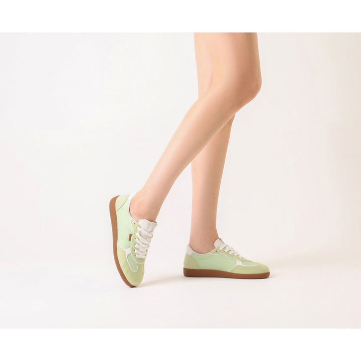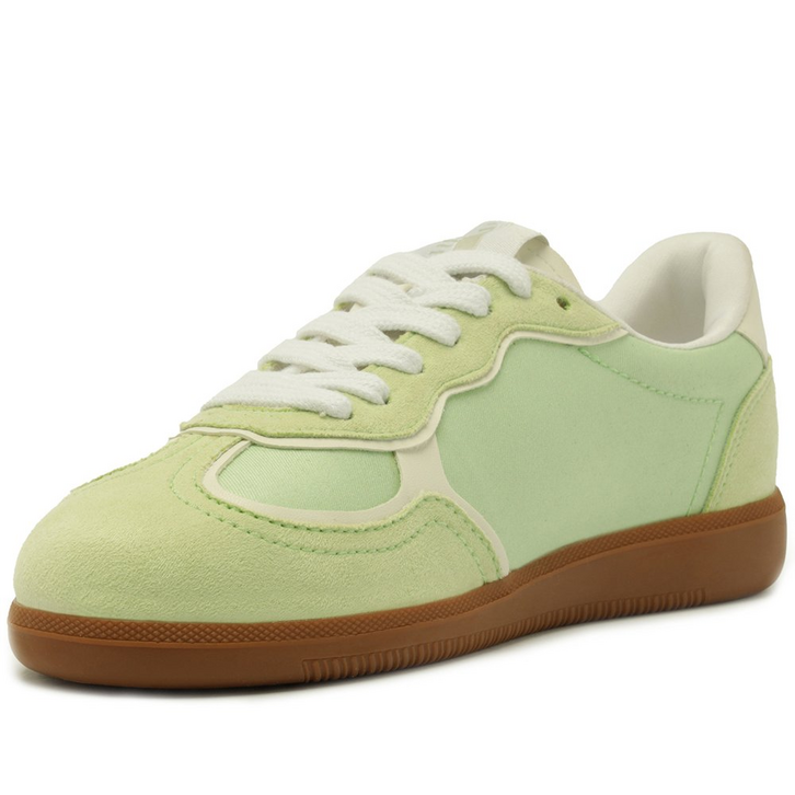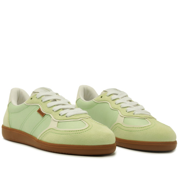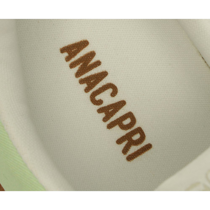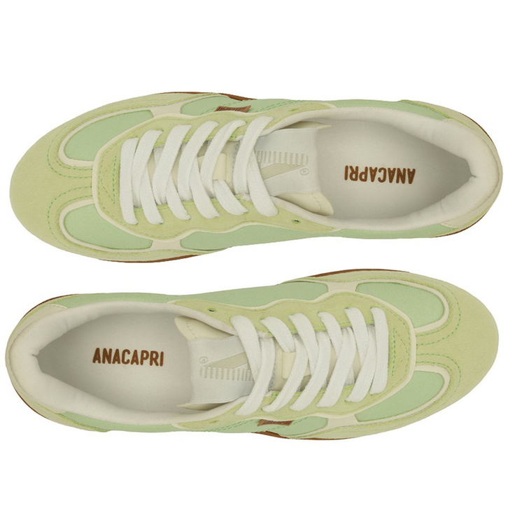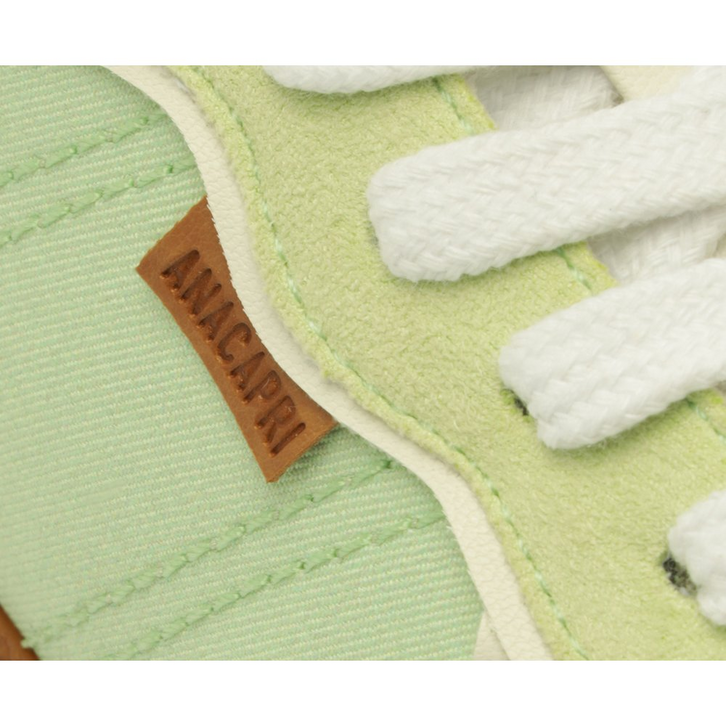 Tênis A'25 Verde Menta. De solado baixo emborrachado em goma nude vulcanizada, o modelo apresenta cabedal com mix de materiais: tecido de nylon e camurça. Traz novidade na construção - detalhe de costura pesponto imponente nas laterais e contornos, com design de recortes modernos e ondulados com peças em verde contrastante, aplicadas na biqueira, na parte traseira e na lingueta. De amarrar, com atacadores brancos, possui parte interna forrada em branco. Com tag lateral marrom Anacapri. O tênis traz a nova etiqueta tecida Anacapri aplicada na lingueta: branca, com design moderno e urbano, o modelo A'25 - nome que leva o ano de lançamento.