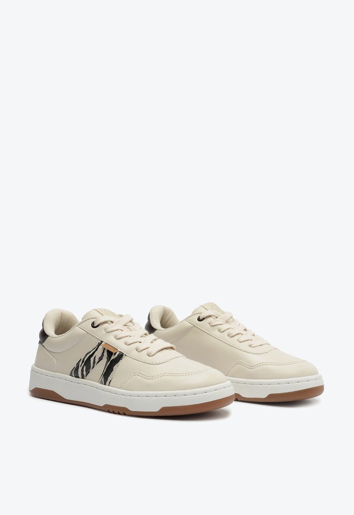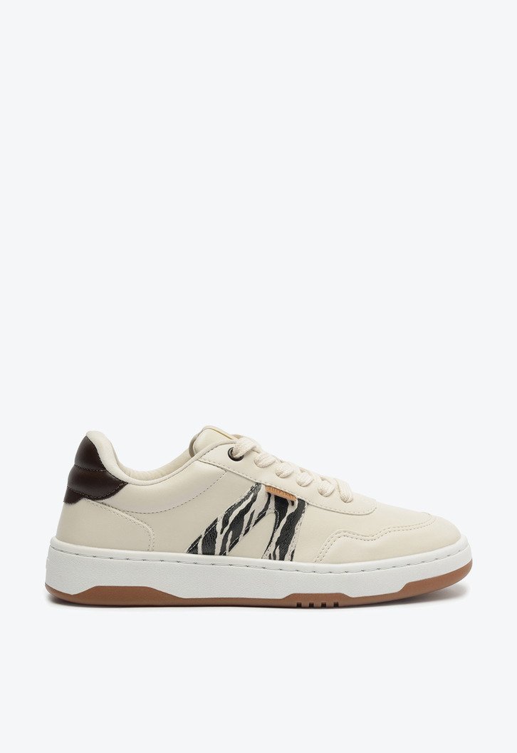Tênis AC1119 Animal Print Zebra. Com construção de novo solado: baixo, emborrachado e tratorado marrom, o modelo apresenta design de costura pesponto nas laterais e contornos, com recorte em peça em napa aplicada na parte traseira e peças em suede aplicadas na lingueta, biqueira e parte traseira. De amarrar por atacadores, possui parte interna forrada. Com aplicação de peça recortada com design em “A” em napa e tag lateral marrom Anacapri.