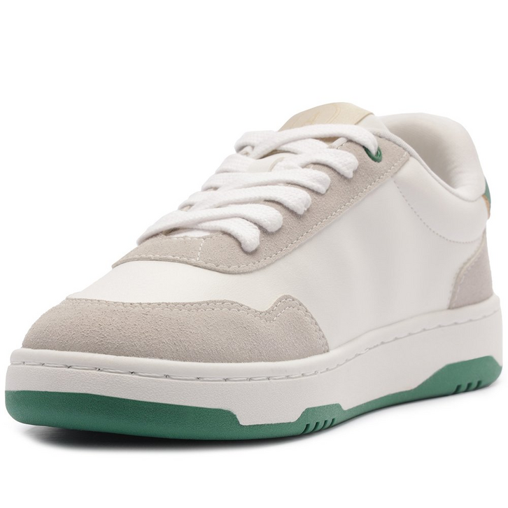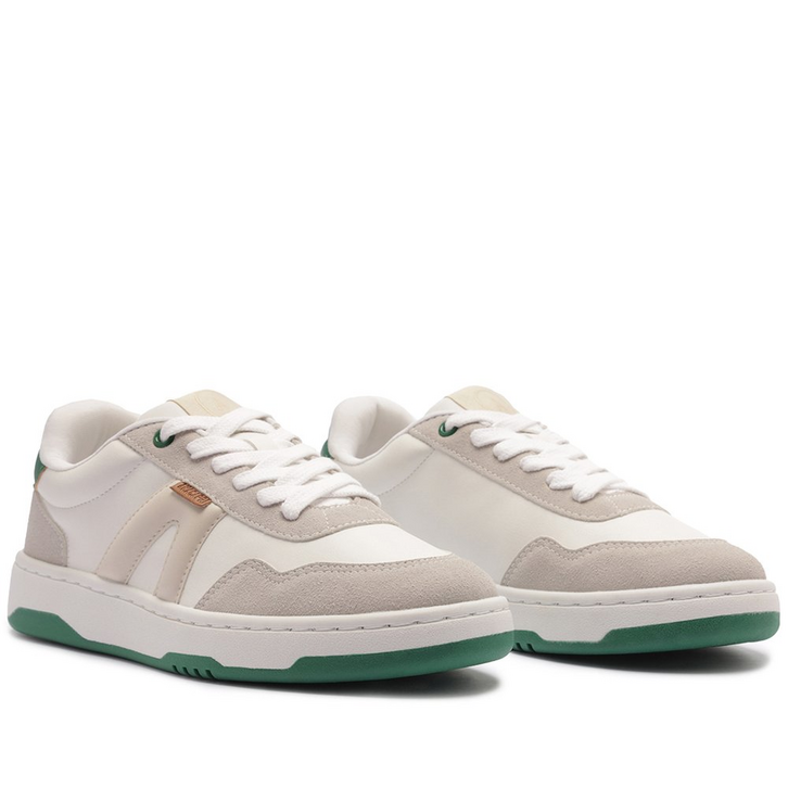 Tênis AC1119 em cinza e verde . Com construção de novo solado: baixo, emborrachado e tratorado preto, o modelo apresenta design de costura pesponto nas laterais e contornos, com recorte em peça em napa verde aplicada na parte traseira e peças em suede cinza aplicadas na lingueta, biqueira e parte traseira. De amarrar por atacadores, possui parte interna forrada. Com aplicação de peça recortada com design em “A” em napa verde e tag lateral marrom Anacapri.
