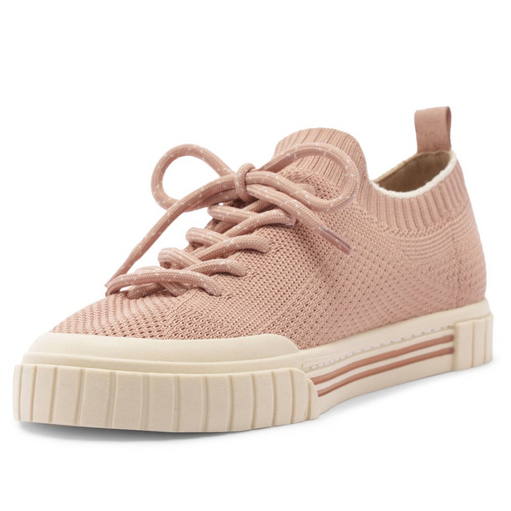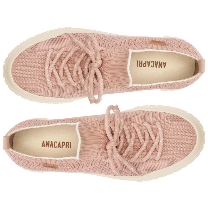 Tênis slip on Alê em knit rosa. O modelo possui biqueira emborrachada texturizada e solado baixo emborrachado branco com detalhe em duas listras rosa na lateral. Com corpo em knit brilhoso - tecido que se ajusta como uma meia no pé com detalhe em brilhos por todo o cabedal. Vem com fita em gorgurão de mesmo tom aplicada na parte traseira, facilitando o calce. Com tag lateral em tecido marrom, com assinatura Anacapri.