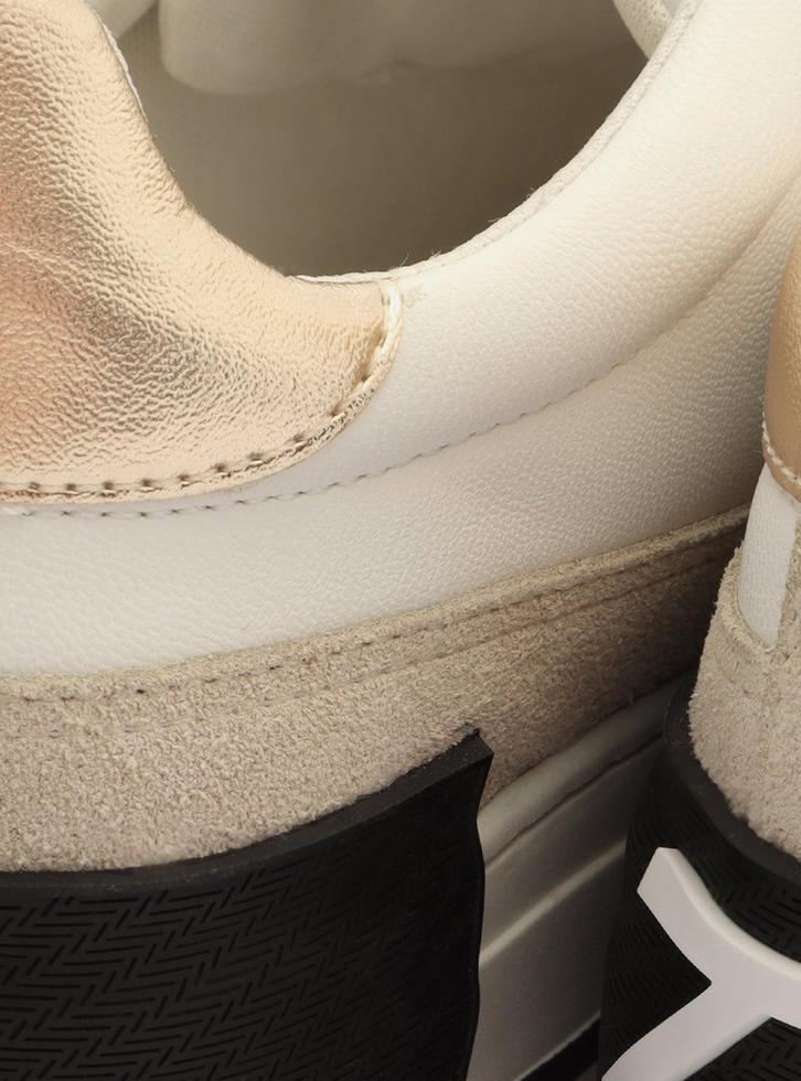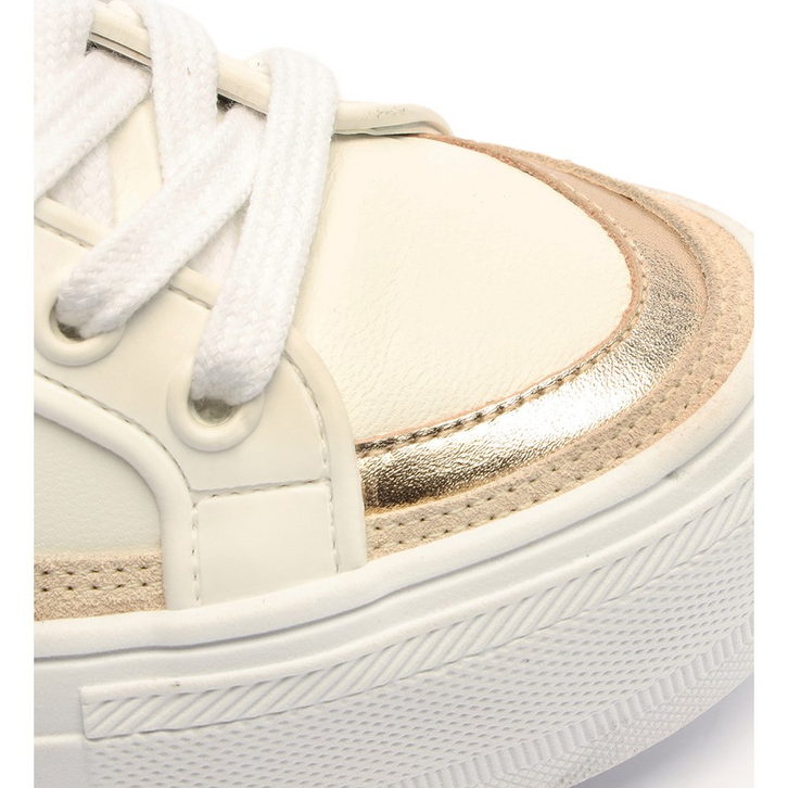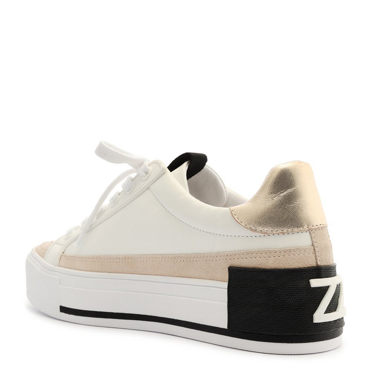 Tênis branco, preto e bege em couro e camurcina. O modelo de amarração tem solado flatform emborrachado branco com risca lateral preta e aplicação emborrachada texturizada na parte traseira com inscrição ZZ em alto-relevo. Traz cabedal em couro branco com contorno em camurcina bege e detalhe em couro dourado no calcanhar e biqueira. De bico redondo, o tênis tem fecho em cadarços brancos, tag em gorgurão na língua e inscrição ZZ Mov na lateral do cabedal. Porque ApostarO tênis possui um design básico e aposta em detalhes diferenciados, que inserem um toque urbano e divertido. Garantia de muito conforto e estilo, cria looks despojados e combina com as mais diversas peças. O modelo é ideal para acompanhar o dia a dia e é aquele item atemporal para se ter sempre no guarda-roupa!