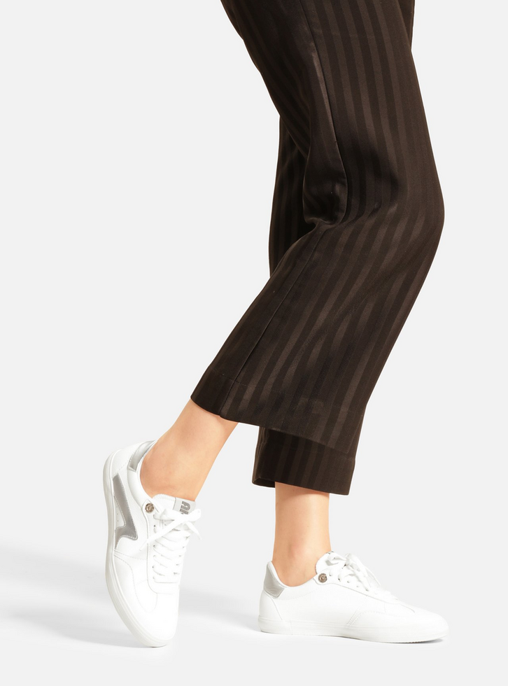 Tênis branco de cano baixo com detalhes laterais e traseiros em prateado metálico. Possui fechamento por cadarço branco e um design casual moderno com um toque de brilho e parte frontal em camurça.