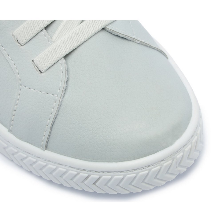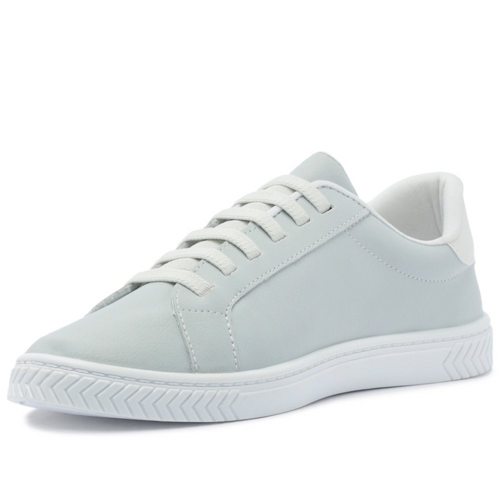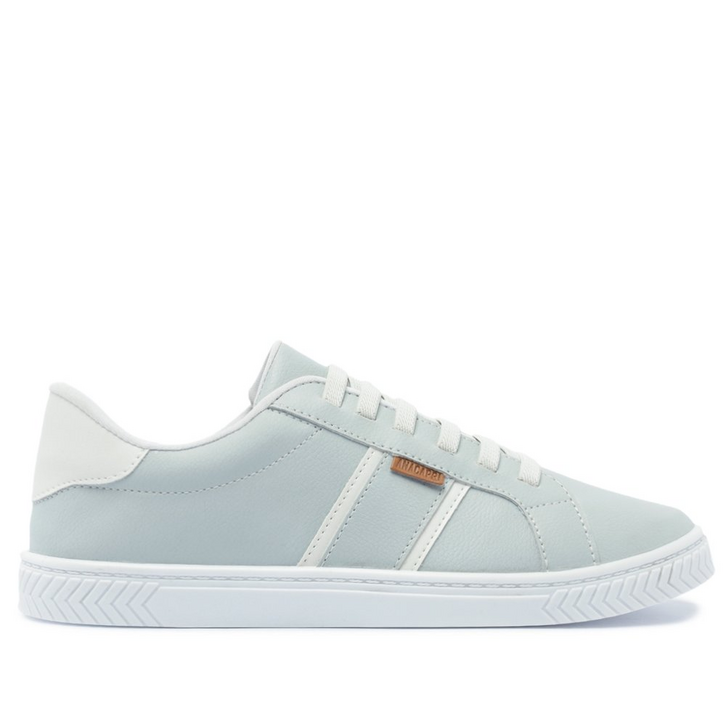 Tênis cinza no tornozelo e em duas listrinhas nas laterais. Solado branco, atacadores em elástico branco e tag marrom lateral com o nome da marca.