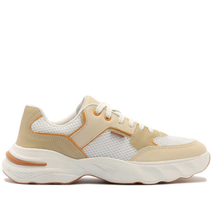 Tênis Chunky Branco Detalhe Laranja. O tênis apresenta a construção do novo solado esportivo emborrachado branco com detalhes em laranja. Traz cabedal em tecido de nylon branco com aplicações de peças em napa em torno da biqueira, calcanhar e laterais - com design de recortes, contorno em pesponto e detalhe telado em perfuros, proporcionando maior respirabilidade para o tênis. Detalhe em ilhós com ponto de cor e atacadores em branco. Apresenta aplicação de tag marrom com assinatura Anacapri na parte lateral traseira do tênis.