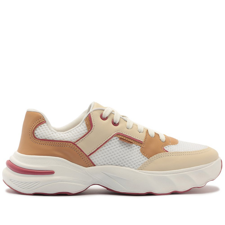 Tênis Chunky Branco Detalhe Vermelho. O tênis apresenta a construção do novo solado esportivo emborrachado branco com detalhes em vermelhos. Traz cabedal em tecido de nylon branco com aplicações de peças em napa em torno da biqueira, calcanhar e laterais - com design de recortes, contorno em pesponto e detalhe telado em perfuros, proporcionando maior respirabilidade para o tênis. Detalhe em ilhós com ponto de cor e atacadores em branco. Apresenta aplicação de tag marrom com assinatura Anacapri na parte lateral traseira do tênis.