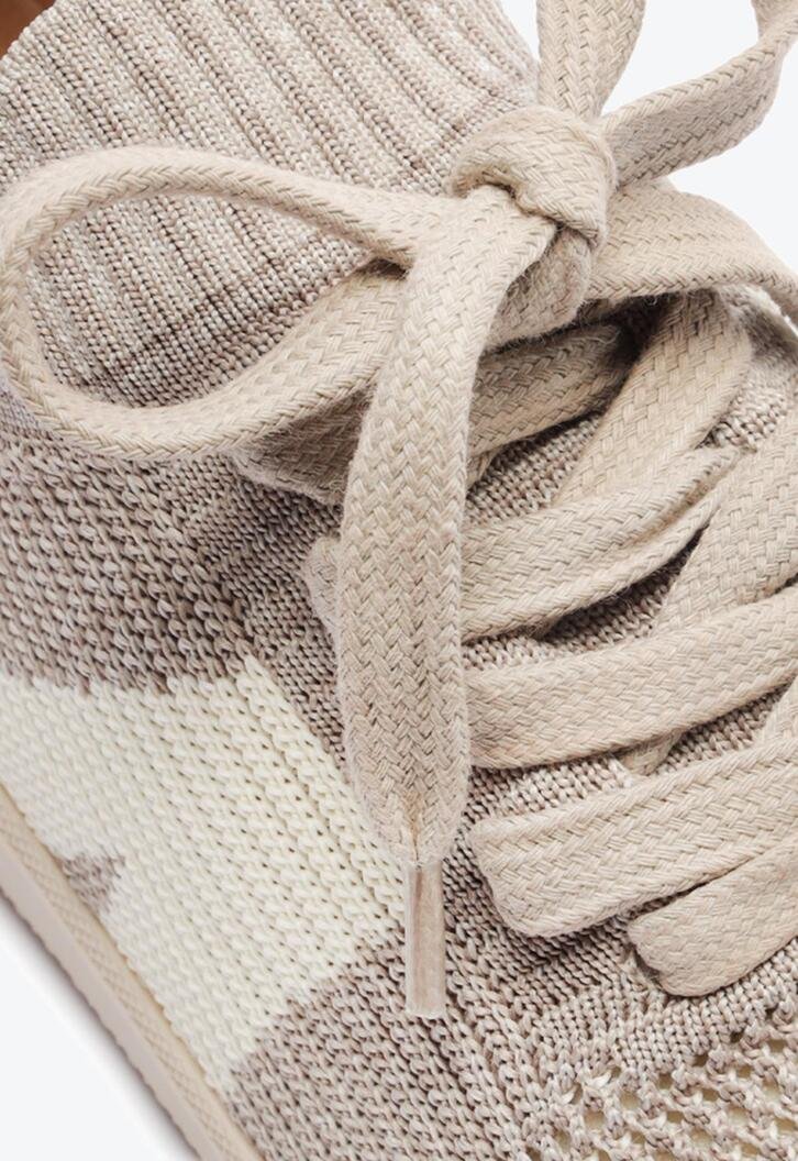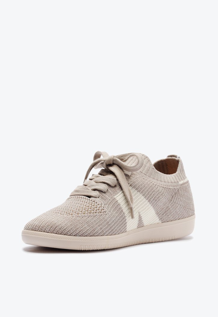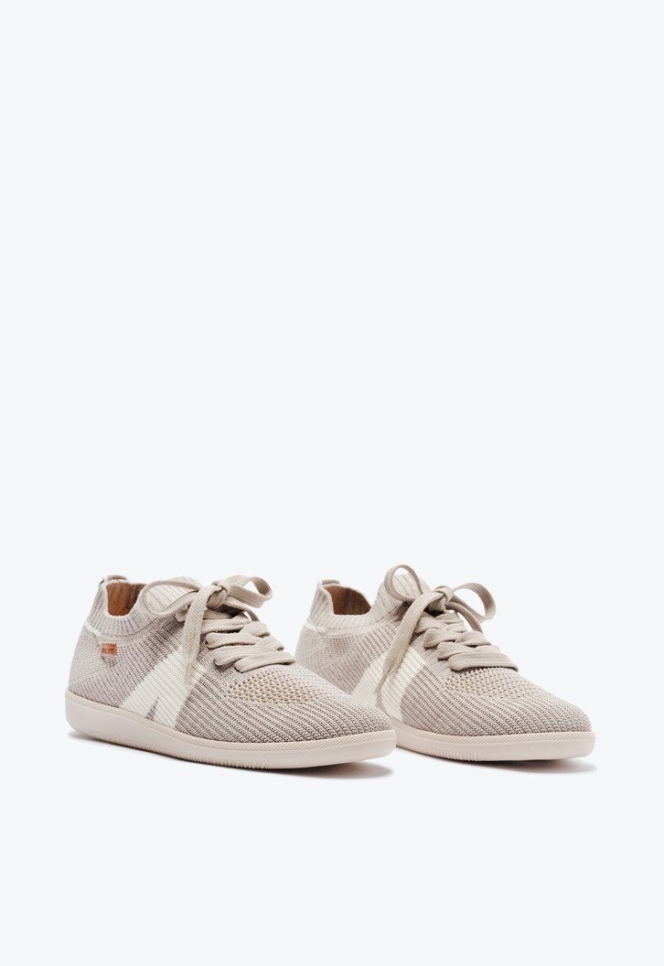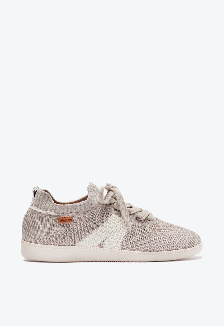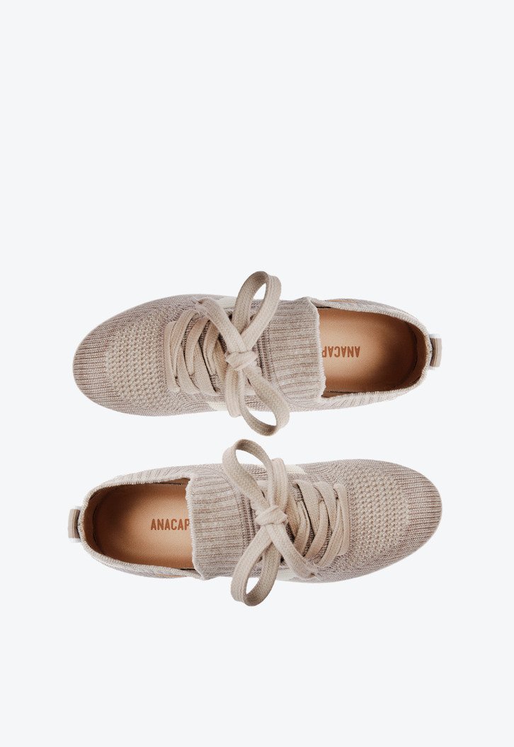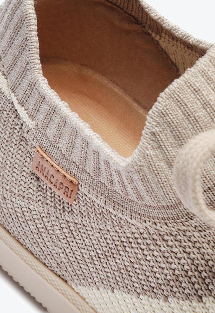 Tênis New Ana em knit,na cor cinza. O modelo possui solado com um design estilo chuteira. Apresenta cabedal em tecido knit vazado, que veste como uma meia no pé. De amarrar, com atacadores, possui parte interna forrada. Traz detalhe lateral com design em “A” em branco e na parte traseira. Com aplicação de tag lateral marrom Anacapri.