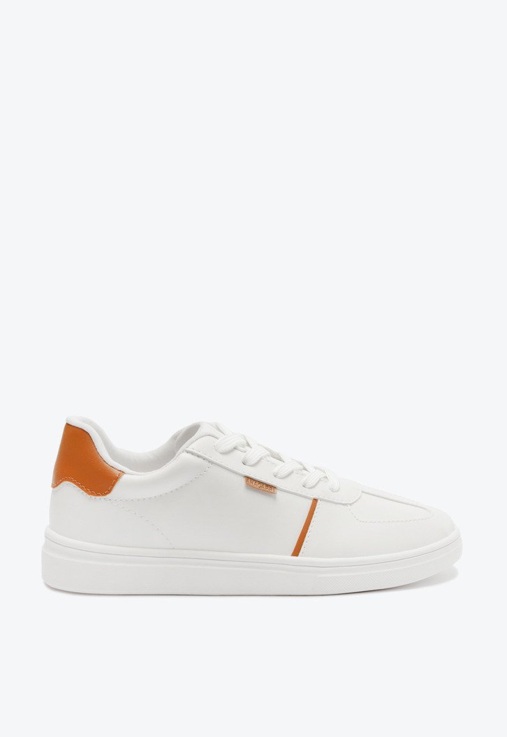 Tênis Detalhe Listra Lateral Branco E Marrom. De solado baixo emborrachado, traz detalhes em design de recortes no cabedal, em peça aplicada na na parte traseira. De bico arredondado, com atacadores em branco. Apresenta recortes nas laterais, biqueira e calcanhar com detalhe em pespontos delicados no contorno de todo o cabedal e detalhe em faixa marrom na lateral. Aplicação de tag marrom lateral com assinatura Anacapri.