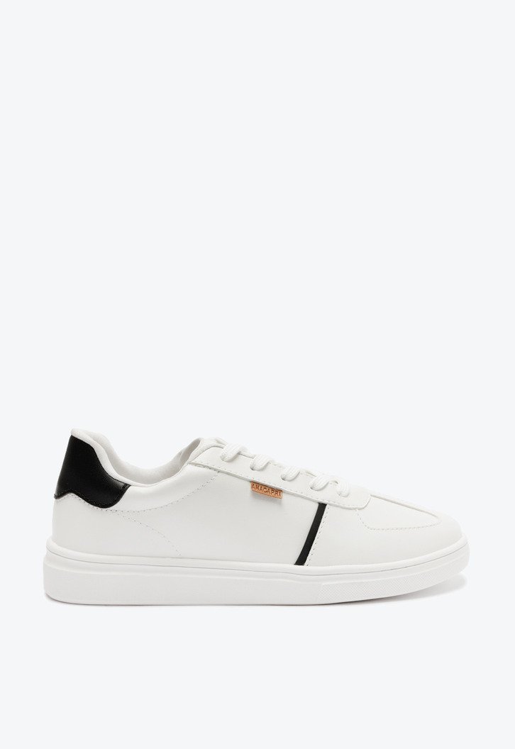 Tênis Detalhe Listra Lateral Branco E Preto. De solado baixo emborrachado, traz detalhes em design de recortes no cabedal, em peça aplicada na na parte traseira. De bico arredondado, com atacadores em branco. Apresenta recortes nas laterais, biqueira e calcanhar com detalhe em pespontos delicados no contorno de todo o cabedal e detalhe em faixa preto na lateral. Aplicação de tag marrom lateral com assinatura Anacapri.