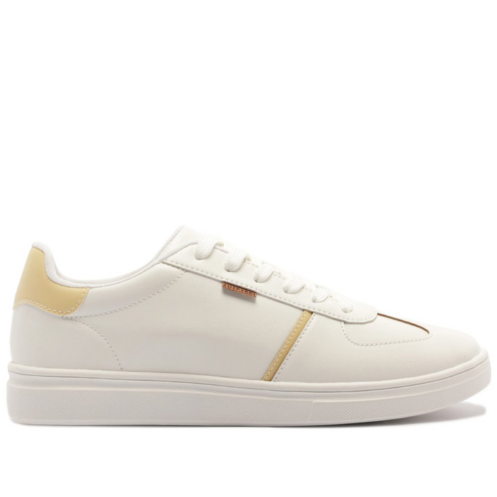 Tênis Detalhe Listra Lateral Branco e Amarelo. De solado baixo emborrachado, traz detalhes em design de recortes no cabedal, em peça aplicada na parte traseira. De bico arredondado, com atacadores em branco. Apresenta recortes nas laterais, biqueira e calcanhar com detalhe em pespontos delicados no contorno de todo o cabedal e detalhe em faixa preto na lateral. Aplicação de tag marrom lateral com assinatura Anacapri.