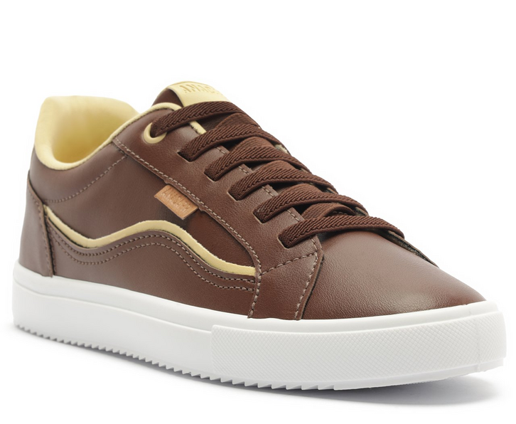 Tênis marrom e amarelo, com detalhe em onda. De solado baixo emborrachado e tratorado, o modelo traz detalhes em design de recortes e costura pesponto delicada no cabedal, com peça em branco aplicada na na parte traseira. De bico arredondado, com atacadores em branco. Apresenta recortes nas laterais, biqueira e calcanhar com detalhe em pespontos delicados no contorno de todo o cabedal e detalhe em faixa contrastante, com shape em onda, na lateral. Aplicação de tag marrom lateral e etiqueta Anacapri na lingueta.