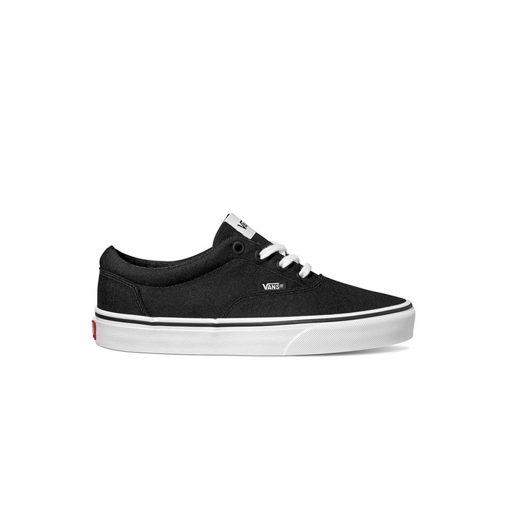 O tênis Vans Doheny Tênis Doheny Canvas possui cabedal de lona resistente na cor preta, viras laterais de borracha na cor branca com biqueiras reforçadas para suportar o desgaste por repetição e ilhós de metal. Apresenta colarinho e lingueta acolchoados para dar apoio e flexibilidade, forro interno de tecido e a original sola waffle de borracha exclusiva Vans. Com aplicação de etiqueta tecida Vans na lateral e na lingueta.