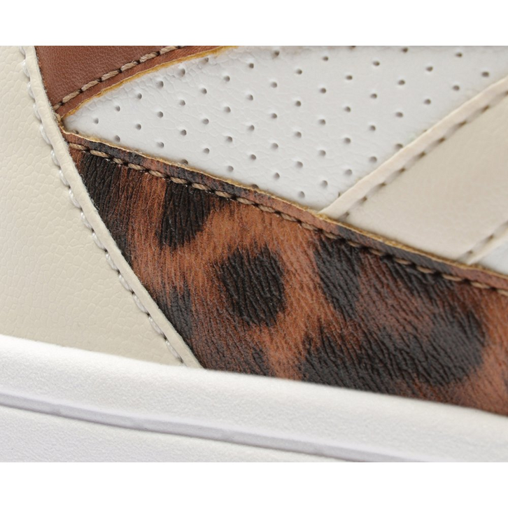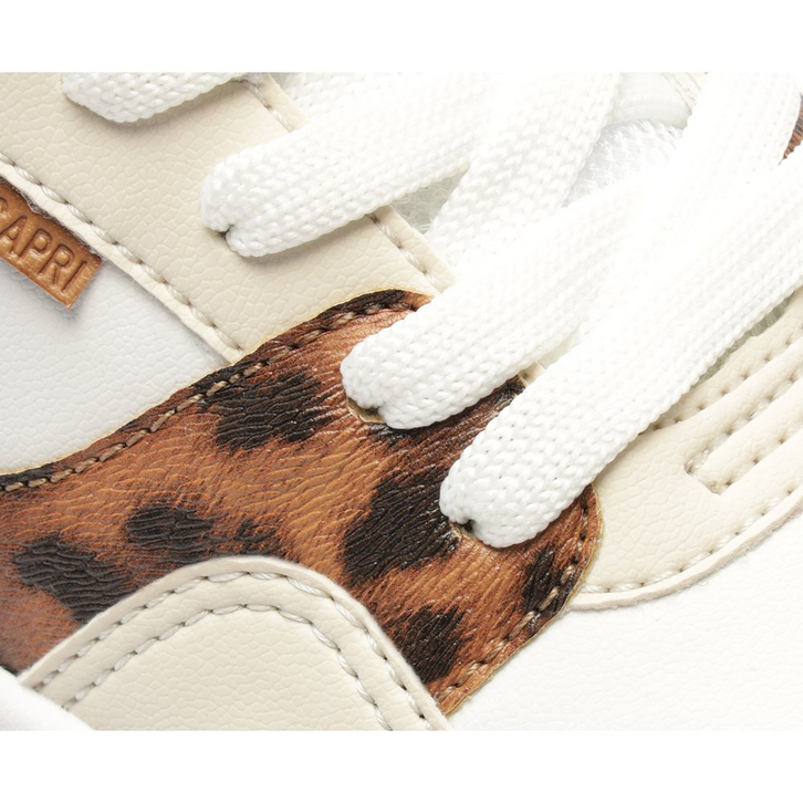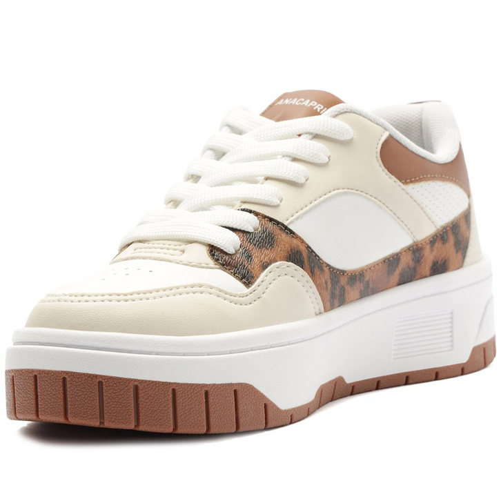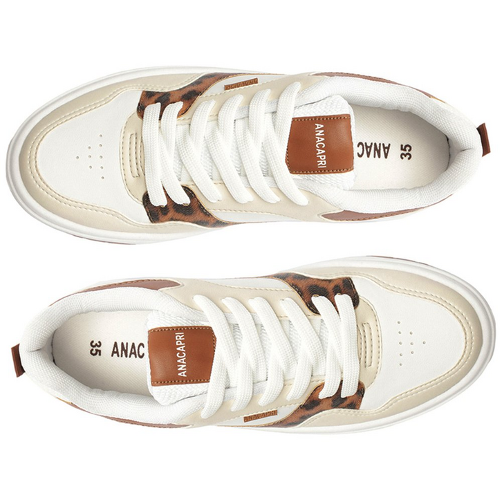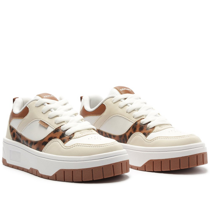 Tênis Emma Animal Print. O modelo apresenta nova construção no solado - mais alto e estruturado, traz sola flatform emborrachada em branco e marrom com detalhe lateral e tratorada. Com um design robusto com aplicação de peças recortadas em animal print por todo o cabedal, traz acabamentos em costura pesponto nos contornos e perfuros no tecido, proporcionando maior respirabilidade para o tênis. De amarrar, com atacadores brancos. Aplicação de tag marrom lateral com assinatura Anacapri.