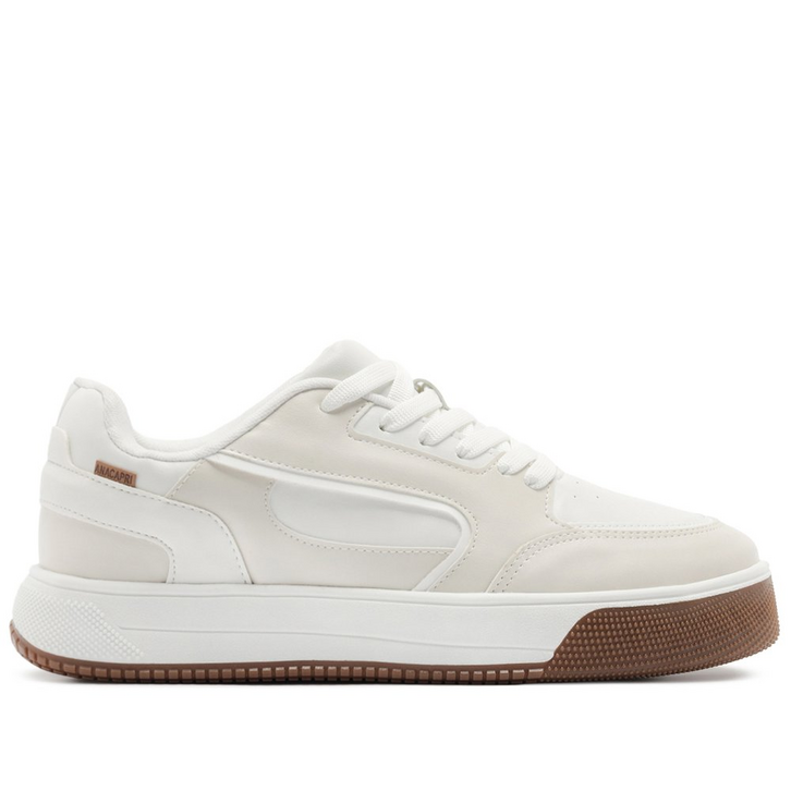Tênis Sporty com detalhe de recortes, em branco e nude. O modelo apresenta nova construção no solado - mais alto e estruturado, traz sola de goma marrom, emborrachada e texturizada, com leve tratorado. Com um design robusto, traz aplicação de mix de peças em napa e camurça, recortadas por todo o cabedal, com acabamentos em costura pontilhada nos contornos e perfuros na biqueira, proporcionando maior respirabilidade para o tênis. De amarrar, com atacadores e aplicação de tag Anacapri marrom na lateral traseira. Forrado na parte interna, com palmilha comfy e assinatura Anacapri.