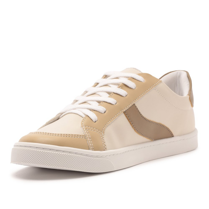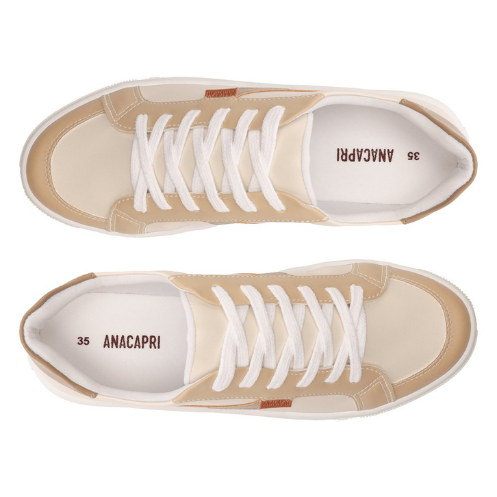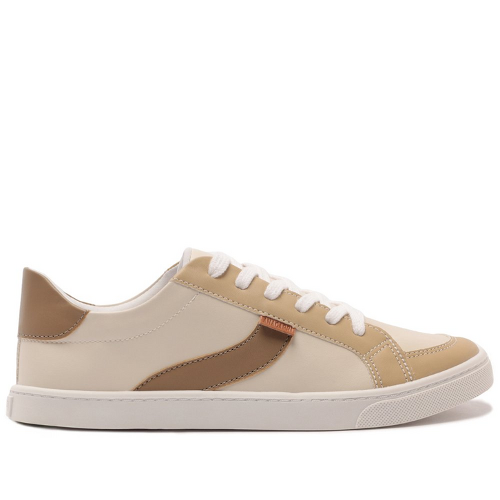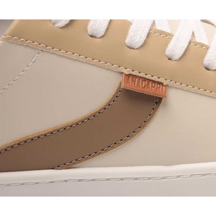Tênis de amarração com detalhe em listra, bege e marrom. De solado baixo emborrachado com textura, o modelo traz detalhes em design de recortes no cabedal, em peças de tons neutros em bege aplicadas na biqueira e laterais, com peça em napa marrom na parte traseira. De biqueira arredondada, com atacadores em branco. Apresenta recortes nas laterais, biqueira e calcanhar com detalhe em pespontos delicados no contorno de todo o cabedal. Traz detalhe imponente em listra lateral em napa marrom, em design ondulado, contornada em pespontos. Aplicação de tag marrom lateral Anacapri.