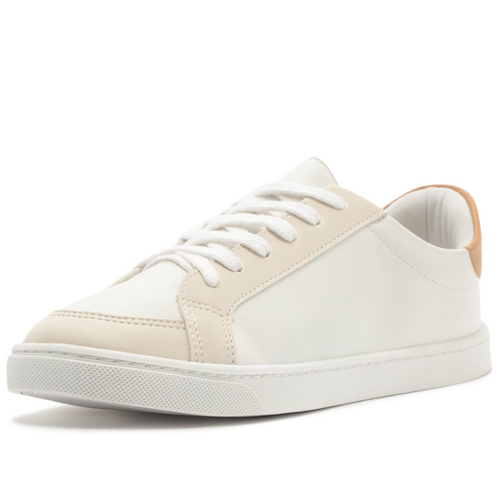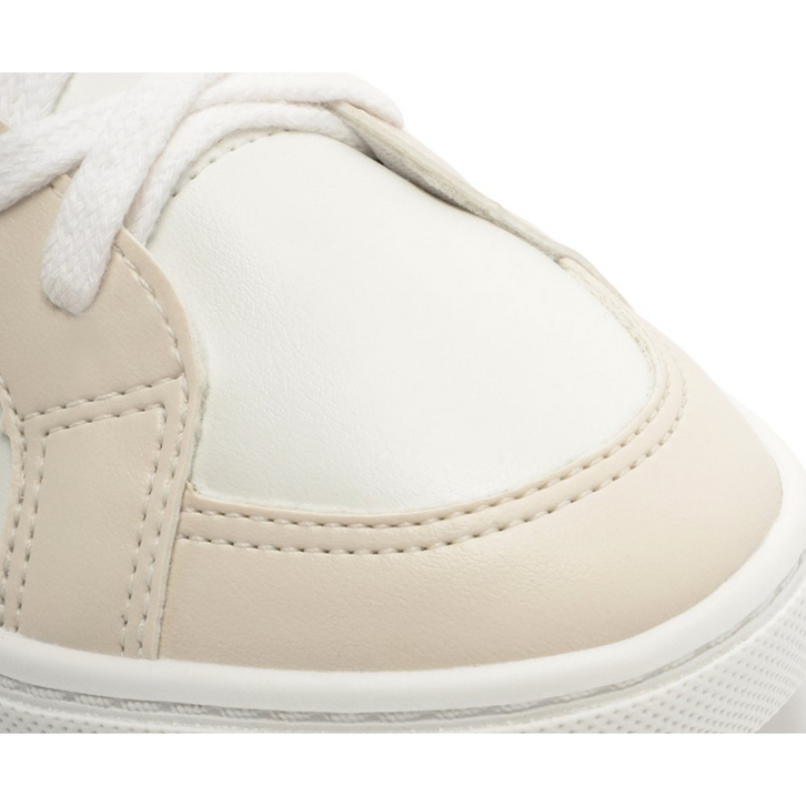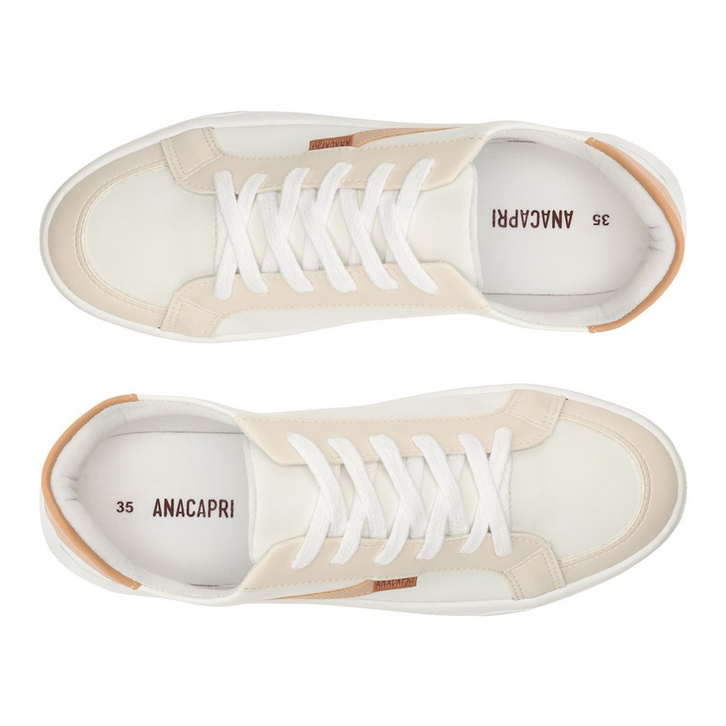 Tênis de amarração com detalhe em listra, branco e marrom. De solado baixo emborrachado com textura, o modelo traz detalhes em design de recortes no cabedal, em peças de tons neutros em bege aplicadas na biqueira e laterais, com peça em napa marrom na parte traseira. De biqueira arredondada, com atacadores em branco. Apresenta recortes nas laterais, biqueira e calcanhar com detalhe em pespontos delicados no contorno de todo o cabedal. Traz detalhe imponente em listra lateral em napa marrom, em design ondulado, contornada em pespontos. Aplicação de tag marrom lateral Anacapri.