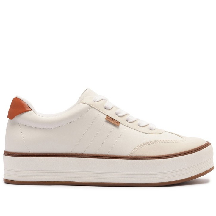 Tênis flatform branco, com detalhe em listra marrom. O modelo de material similar ao couro possui solado flatform emborrachado e amarração por atacadores de mesmo tom do tênis. Traz aplicação de peça marrom na parte traseira e listra de mesmo tom em todo o contorno inferior da sola. Forrado na parte interna, apresenta design de costura pesponto nas laterais e contornos, com efeito pontilhado e perfuros delicados em diagonal nas laterais, com aplicação de tag lateral marrom Anacapri.
