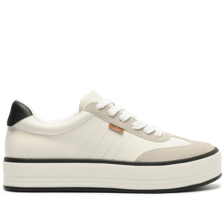 Tênis flatform branco, com detalhe em listra preta. O modelo de material similar ao couro possui solado flatform emborrachado e amarração por atacadores de mesmo tom do tênis. Traz aplicação de peça preta na parte traseira e listra de mesmo tom em todo o contorno inferior da sola. Forrado na parte interna, apresenta design de costura pesponto nas laterais e contornos, com efeito pontilhado e perfuros delicados em diagonal nas laterais, com aplicação de tag lateral marrom Anacapri.