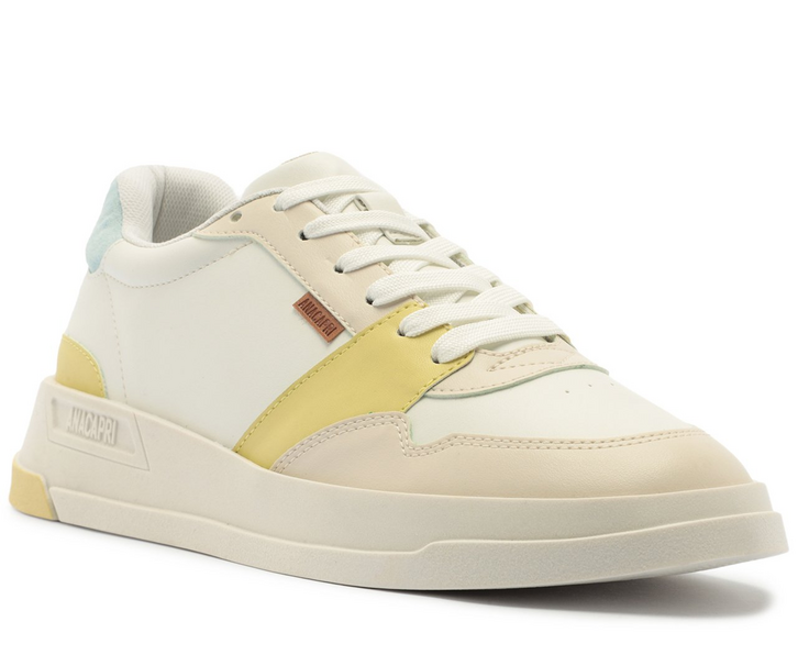 Tênis de amarração com detalhe de recortes, branco e multicolorido. O modelo possui solado alto, moderno e esportivo, com detalhe em placa emborrachada branca Anacapri na parte lateral da sola. Apresenta cabedal com design de recortes, com mix de peças em suede e napa coloridas nos tons de bege, azul e amarelo, aplicadas na biqueira, lingueta e parte traseira. Traz contorno em pespontos delicados e detalhe de perfuros na parte frontal. Com amarração por atacadores brancos. Aplicação de tag marrom lateral Anacapri.