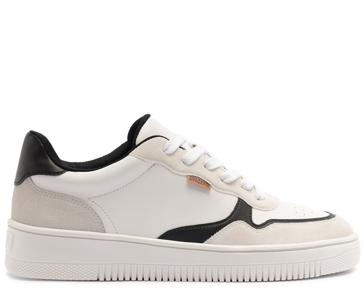 Tênis de amarração e detalhe de recortes, branco e preto. O modelo de material similar ao couro possui solado emborrachado branco, com leve tratorado. Traz design imponente de recortes por todo o cabedal - com peças em camurça nos tons de cinza e preto - aplicadas na biqueira, laterais, parte traseira e no contorno da lingueta. De amarrar, com atacadores brancos, possui detalhe frontal em perfuros e contornos em costura pespontada por toda a peça. O modelo apresenta tag marrom lateral, com assinatura Anacapri.