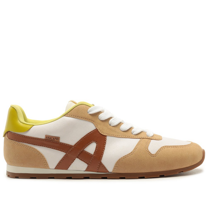 Tênis Lola com detalhe de recortes, em bege. Com um design imponente com aplicação em mix de peças recortadas em napa no calcanhar, traz acabamentos em costura pesponto nos contornos e peças em camurça aplicadas na biqueira, lingueta e calcanhar. De amarrar, com atacadores brancos e aplicação de tag marrom lateral Anacapri. Destaque para peça recortada com design em “A” em napa preto, aplicada na lateral, em direção a parte traseira do tênis. O modelo apresenta solado baixo emborrachado em goma vulcanizada e tratorada marrom, com detalhe traseiro em branco.