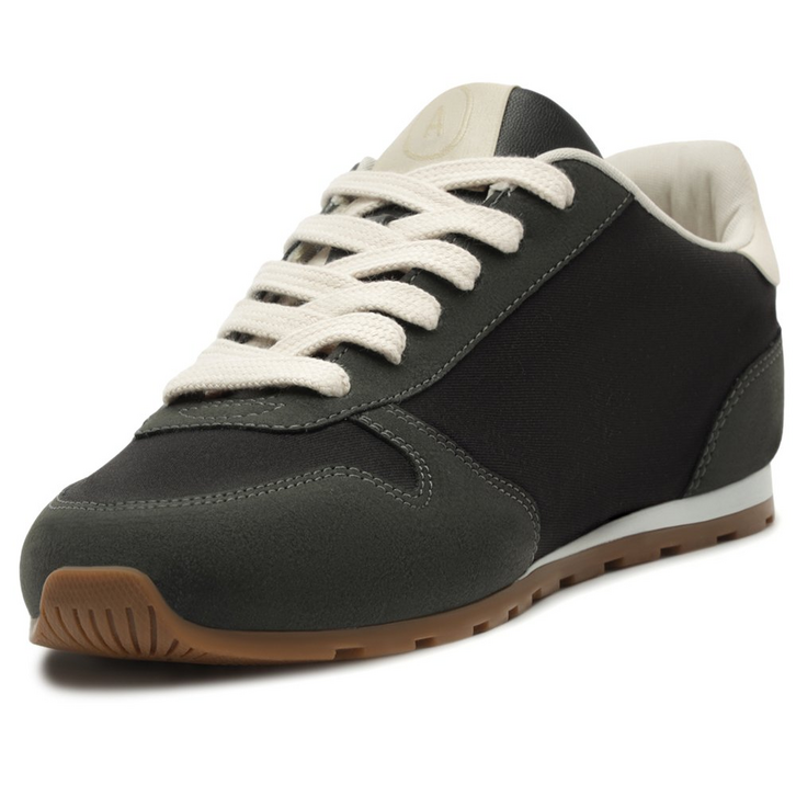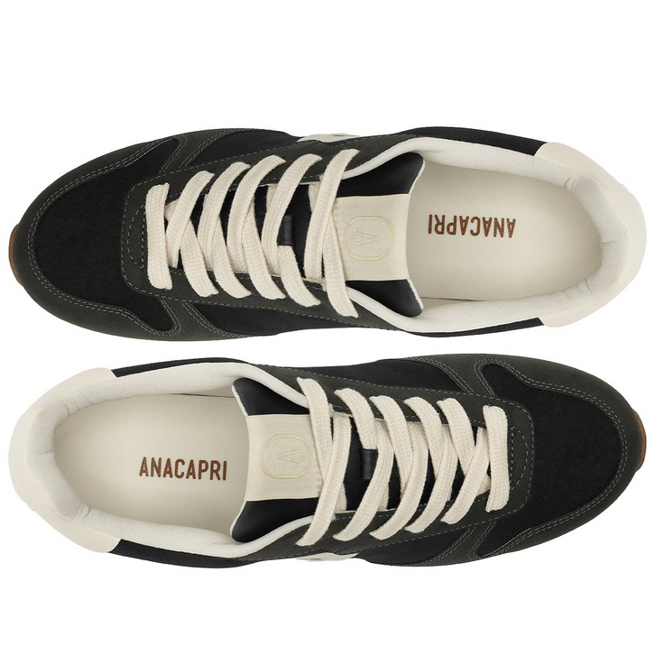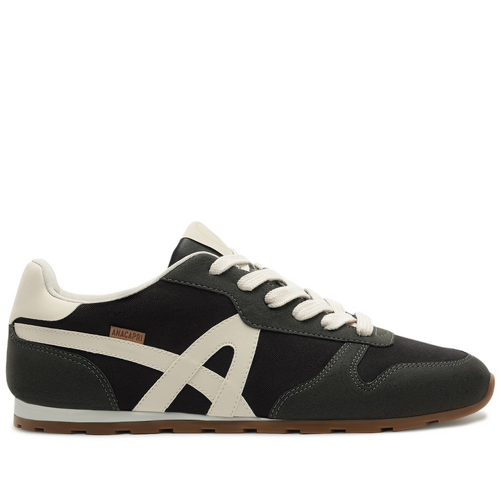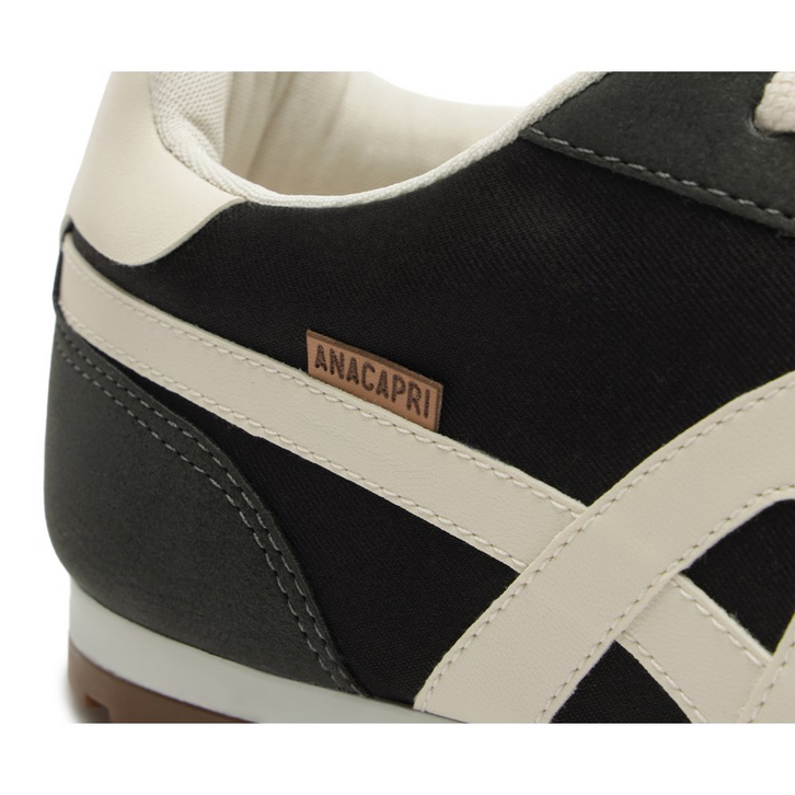 Tênis Lola com detalhe de recortes, em preto. Com um design imponente com aplicação em mix de peças recortadas em napa no calcanhar, traz acabamentos em costura pesponto nos contornos e peças em camurça aplicadas na biqueira, lingueta e calcanhar. De amarrar, com atacadores brancos e aplicação de tag marrom lateral Anacapri. Destaque para peça recortada com design em “A” em napa preto, aplicada na lateral, em direção a parte traseira do tênis. O modelo apresenta solado baixo emborrachado em goma vulcanizada e tratorada marrom, com detalhe traseiro em branco.