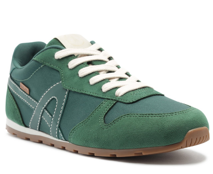 Tênis Lola com detalhe de recortes, em verde. Com um design imponente com aplicação em mix de peças recortadas em napa no calcanhar, traz acabamentos em costura pesponto nos contornos e peças em camurça bege aplicadas na biqueira, lingueta e calcanhar. De amarrar, com atacadores brancos e aplicação de tag marrom lateral Anacapri. Destaque para peça recortada com design em “A” em napa verde, aplicada na lateral, em direção a parte traseira do tênis. O modelo apresenta solado baixo emborrachado em goma vulcanizada e tratorada marrom, com detalhe traseiro em branco.