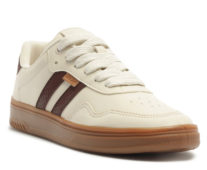 Tênis Lua com detalhe em listra dupla, na cor branco off e marrom. O modelo traz o shape clássico do tênis Smart A, totalmente repaginado para a temporada de inverno Anacapri. De material similar ao couro, apresenta detalhe em costura pespontada imponente no contorno da biqueira, pontilhado nas laterais e perfuros na parte superior, proporcionando respirabilidade para o tênis. Apresenta duas listras laterais contrastantes em marrom, com aplicação de peça traseira no mesmo tom das listras. Possui detalhe moderno e texturizado com design no solado, proporcionando maior conforto e estabilidade no calce. De amarração por atacadores, traz assinatura Anacapri na palmilha, tag marrom lateral e etiqueta emborrachada Anacapri na lingueta.
