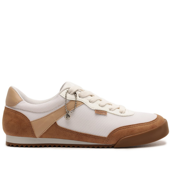 Tênis Lucy, com detalhe de recortes e pingente, em branco e marrom. De solado baixo emborrachado em goma vulcanizada e tratorada marrom, com detalhe traseiro em branco. O modelo de cabedal em nylon, apresenta design de costura pesponto nas laterais e contornos, com aplicação de peças em camurça e napa - nos tons de bege e marrom - na biqueira, laterais e parte traseira. De amarrar, com atacadores brancos, possui aplicação de tag lateral marrom Anacapri. Destaque para pingente metálico redondo com assinatura Anacapri, preso na lateral da peça, por correntinha delicada.