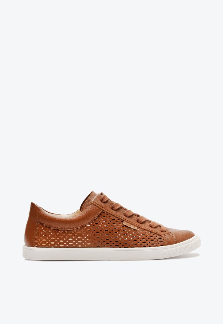 Tênis Ana detalhado, na cor marrom. O modelo com solado branco flat e material similar ao couro, traz cabedal com design imponente de recorte a laser nas laterais. De amarrar por atacadores de mesmo tom do tênis e forrado na parte interna, apresenta palmilha confortável e tag marrom Anacapri aplicada na lateral.