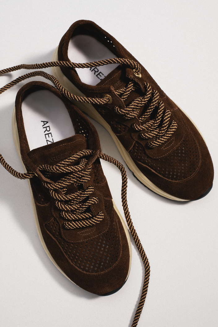 Tênis marrom de camurça. O sapato tem sola baixa esportiva, emborrachada e branca, com relevo e base levemente tratorada preta, além de formato arredondado na ponta. Possui cabedal vazado em camurça com sobreposições. Traz fechamento por cadarço bicolor.