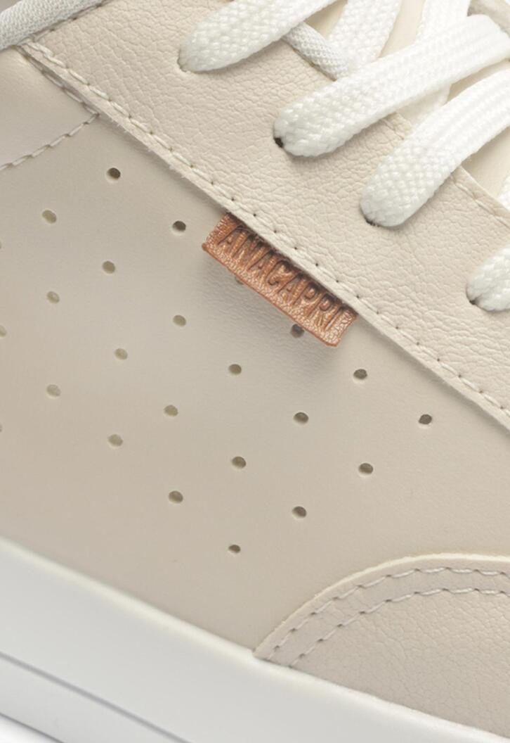 Tênis Anacapri flatform Nude. De sola alta flatform branca vulcanizada com detalhes coloridos em preto na biqueira e parte traseira, o modelo apresenta design de perfurações nas laterais e recortes coloridos por todo o cabedal, nos tons de nude. De amarrar, com atacadores brancos, possui parte interna forrada na cor preta. Com aplicações de tag marrom lateral com inscrição do nome da marca.