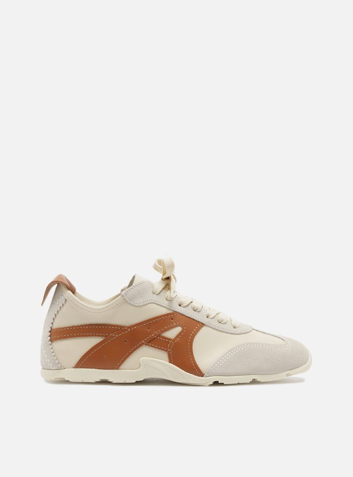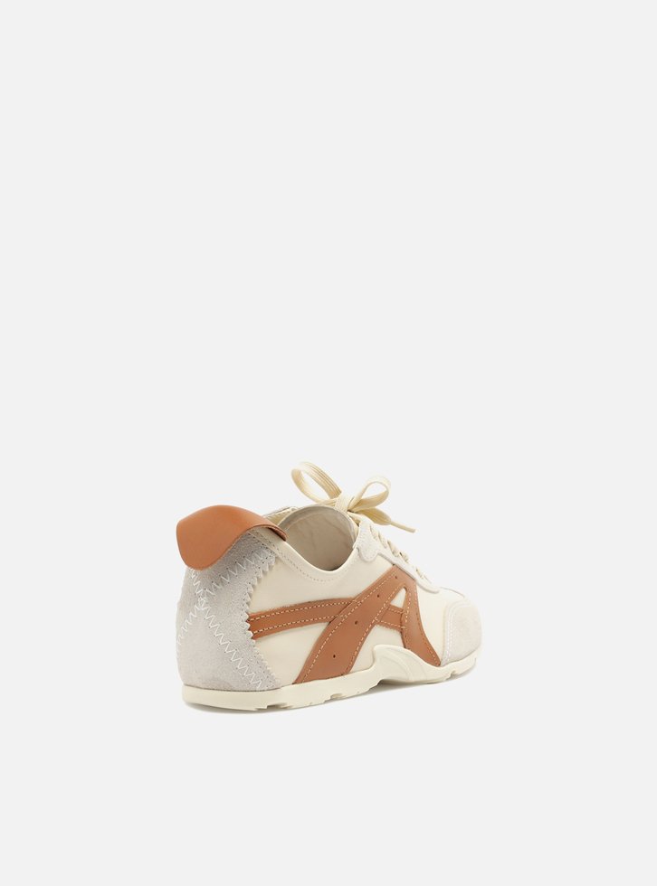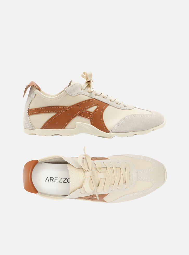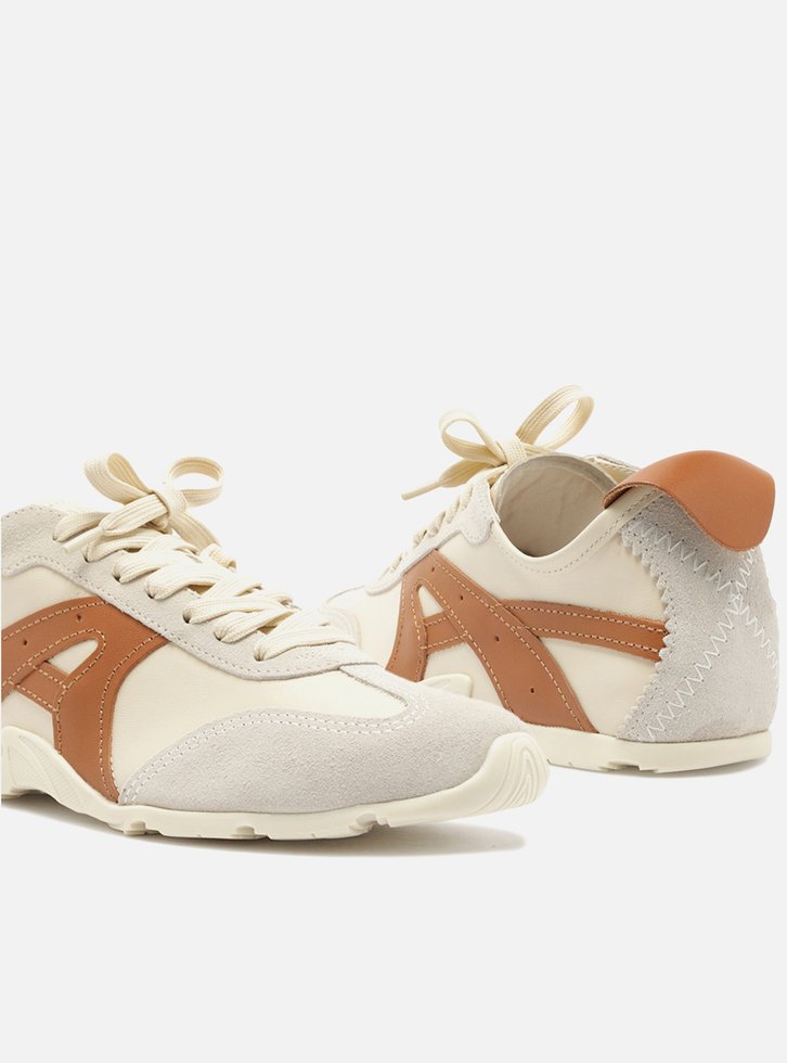 Tênis off-white multimaterial. O tênis de amarração tem solado baixo emborrachado branco tratorado. Traz cabedal em couro com recortes e aplicações em couro marrom e camurça cinza no calcanhar e nas laterais. Com formato arredondado na ponta, tem fecho em cadarços brancos.