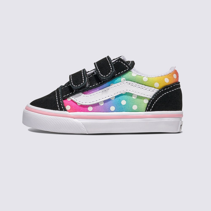 O tênis Old Skool V Polka Dots para criança traz o icônico Sidestripe™ e o estilo atemporal da Vans aos pezinhos. Projetado com durabilidade e conforto em mente, possui fechos de velcro para fácil colocação e retirada, tornando-o perfeito para crianças prontas para explorar. Um verdadeiro clássico, reinventado para a próxima geração.