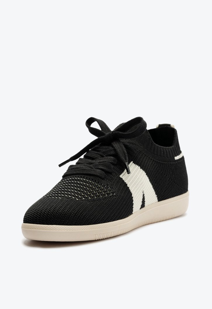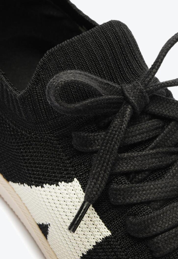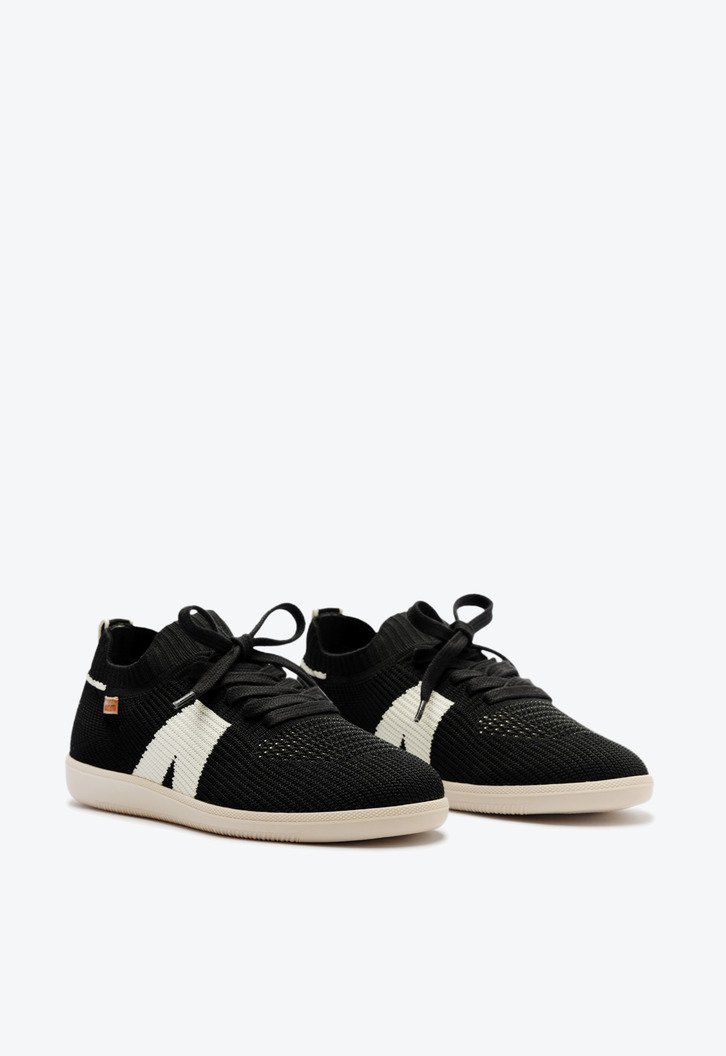 Tênis New Ana em knit,na cor preta. O modelo possui solado com um design estilo chuteira. Apresenta cabedal em tecido knit vazado, que veste como uma meia no pé. De amarrar, com atacadores, possui parte interna forrada. Traz detalhe lateral com design em “A” em branco e na parte traseira. Com aplicação de tag lateral marrom Anacapri.
