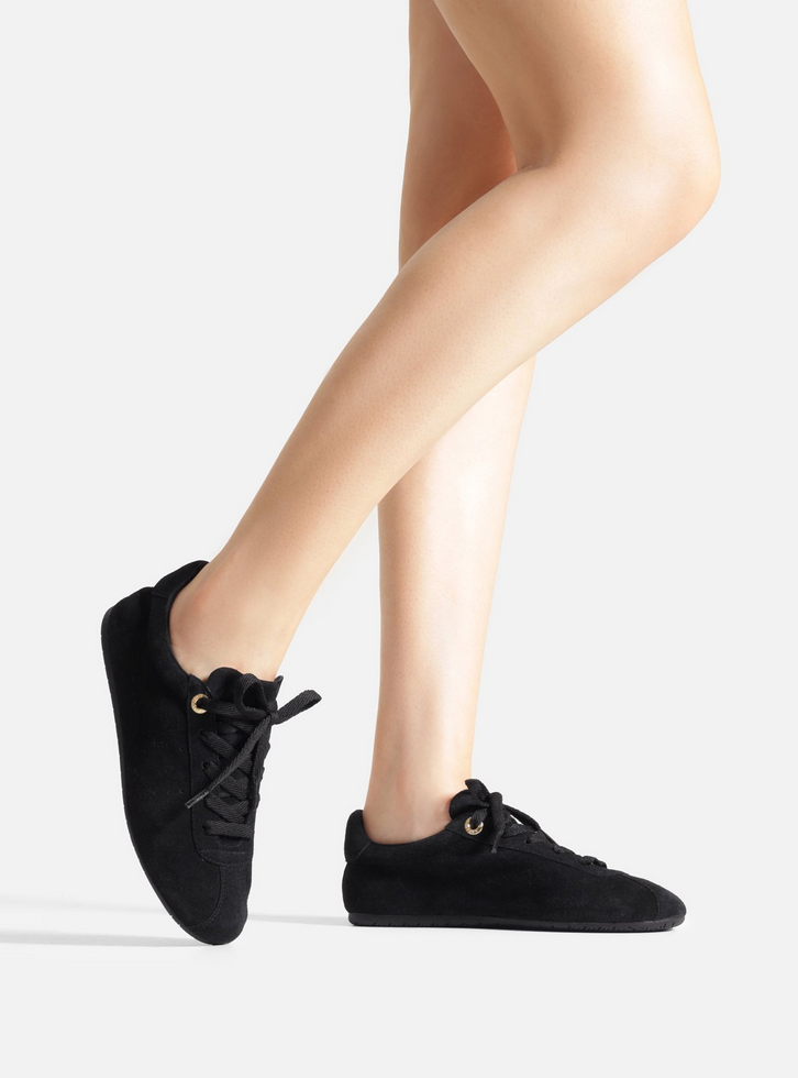 Tênis feminino preto em camurça. O sapato tem sola baixa emborrachada flat e formato arredondado na ponta. Possui cabedal em camurça com detalhe de perfuros nas laterais. Fechado, traz fecho em cadarços no mesmo tom do calçado.