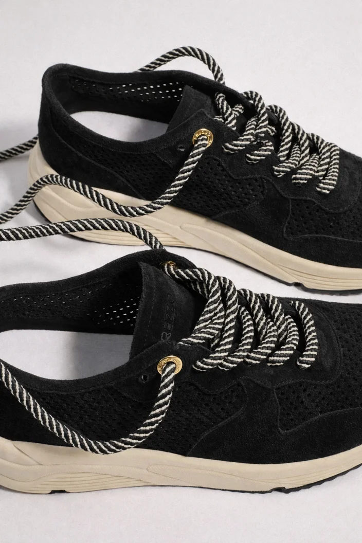 Tênis preto de camurça. O sapato tem sola baixa esportiva, emborrachada e branca, com relevo e base levemente tratorada preta, além de formato arredondado na ponta. Possui cabedal vazado em camurça com sobreposições. Traz fechamento por cadarço bicolor.