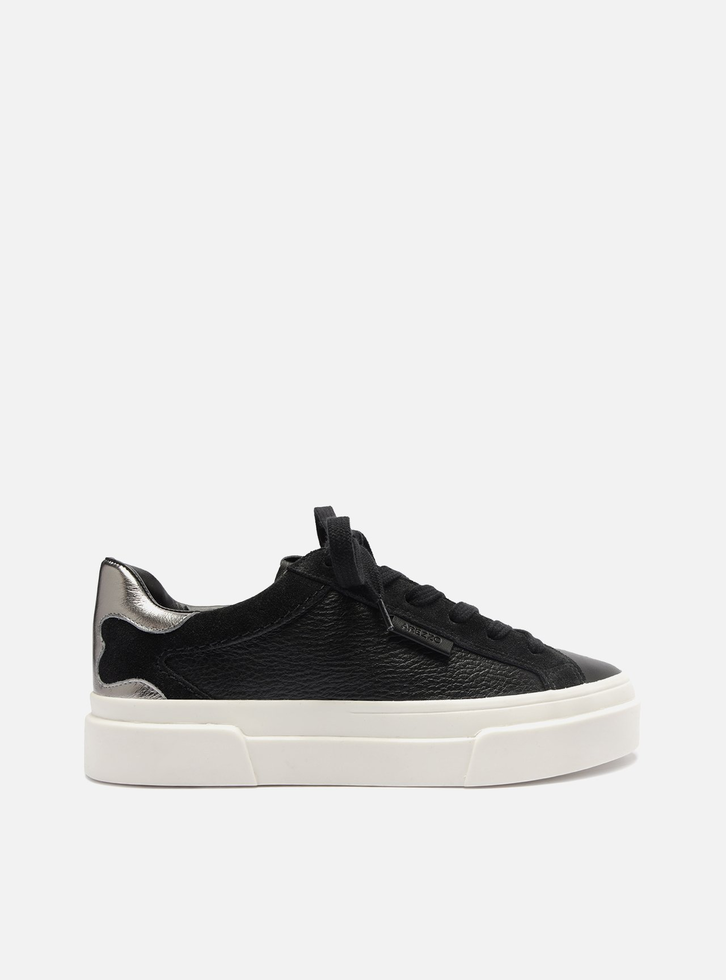 Tênis preto de couro. O modelo de amarração tem solado flatform emborrachado branco. Traz aplicações em camurcina preta no cabedal e em couro prateado no calcanhar. De bico redondo, o tênis tem fecho em cadarços pretos e tag do nome da marca na língua e na lateral.