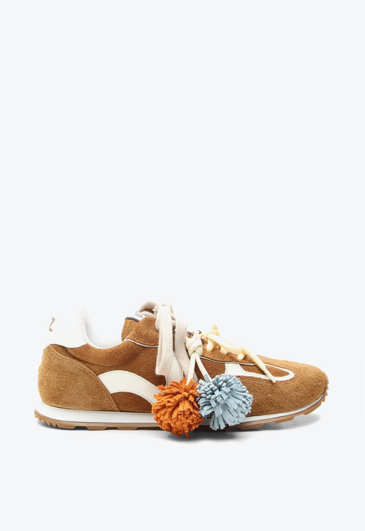 Tênis Prince Marrom traz textura e atitude em um design cheio de personalidade. Em camurça, ganha destaque com recortes contrastantes e pompons decorativos em laranja e azul, que adicionam um toque artesanal e lúdico ao visual. O modelo combina dois tipos de cadarço, com aplicações em metal dourado que reforçam o caráter autoral da peça. Leve e confortável, é um sneaker urbano e versátil, ideal para produções descontraídas com estilo.