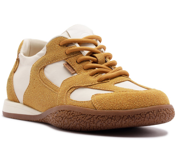 Tênis Recortes com Cadarço Duplo, na cor amarela. Com construção de solado bicolor emborrachado branco e marrom texturizado, o modelo apresenta design com recortes nas laterais, combinando acabamento acamurçado e partes em material liso. De amarrar o modelo acompanha um atacador branco e um atacador no mesmo tom do tênis, permitindo personalização no uso. Possui biqueira arredondada, parte interna forrada e detalhe de tag lateral marrom com assinatura Anacapri. A sola emborrachada garante estabilidade e conforto no caminhar, reforçando o visual moderno do modelo.