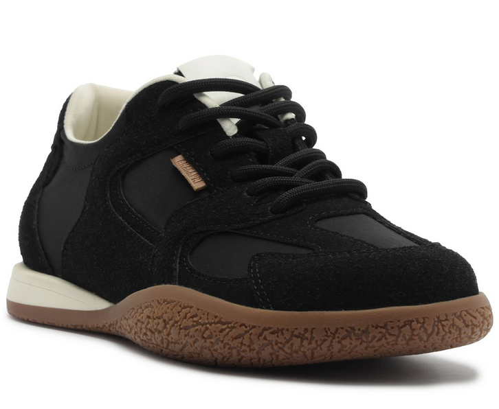 Tênis Recortes com Cadarço Duplo, na cor preta. Com construção de solado bicolor emborrachado branco e marrom texturizado, o modelo apresenta design com recortes nas laterais, combinando acabamento acamurçado e partes em material liso. De amarrar o modelo acompanha um atacador branco e um atacador no mesmo tom do tênis, permitindo personalização no uso. Possui biqueira arredondada, parte interna forrada e detalhe de tag lateral marrom com assinatura Anacapri. A sola emborrachada garante estabilidade e conforto no caminhar, reforçando o visual moderno do modelo.