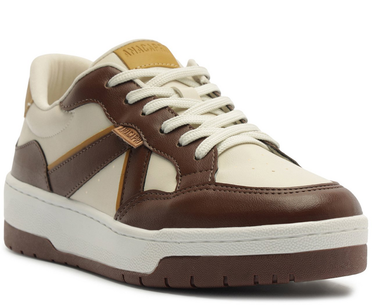 Tênis Recortes Kei Bege e Marrom. O modelo apresenta nova construção no solado - mais alto e estruturado, traz sola flatform emborrachada em branco com detalhe lateral e tratorado. Com um design robusto com aplicação em mix de peças recortadas em napa no calcanhar, traz acabamentos em costura pontilhada nos contornos e perfuros nas laterais e biqueira, proporcionando maior respirabilidade para o tênis. De amarrar, com atacadores brancos. Aplicação de tag marrom lateral com assinatura Anacapri.