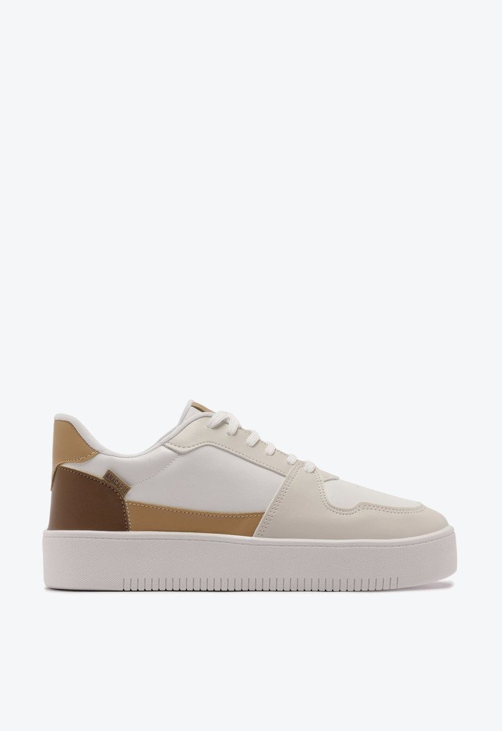 Tênis de amarração com sola alta e detalhe de recortes, branco e bege. O modelo de solado flatform imponente branco - traz design imponente de recortes por todo o cabedal - com peças nos tons de marrom e bege aplicadas na biqueira, laterais, parte traseira e no contorno da lingueta. De amarrar, com atacadores brancos, possui detalhe frontal em perfuros e contornos em costura pespontada por toda a peça. O modelo apresenta tag marrom lateral traseira, com assinatura Anacapri.