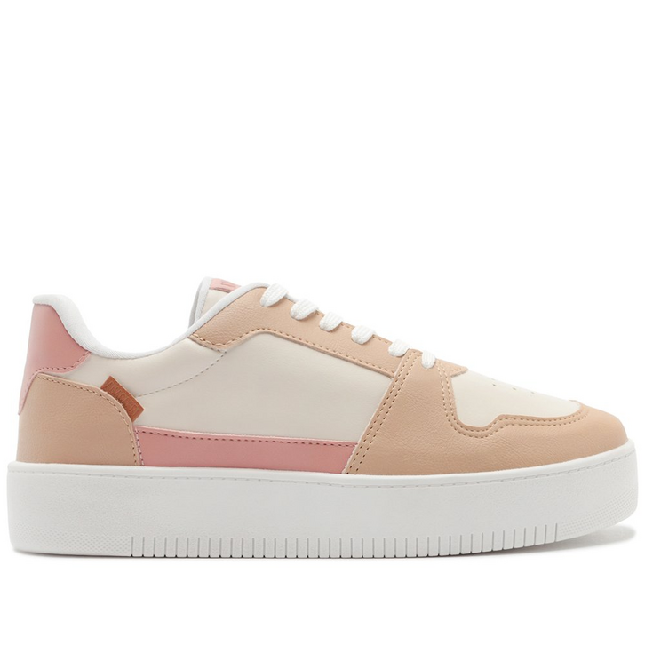 Tênis de amarração com sola alta e detalhe de recortes, branco e rosa. O modelo de solado flatform imponente branco - traz design imponente de recortes por todo o cabedal - com peças nos tons de rosa e bege aplicadas na biqueira, laterais, parte traseira e no contorno da lingueta. De amarrar, com atacadores brancos, possui detalhe frontal em perfuros e contornos em costura pespontada por toda a peça. O modelo apresenta tag marrom lateral traseira, com assinatura Anacapri.