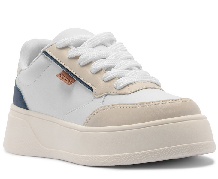 Tênis de amarração e sola alta, com detalhe de recortes, em branco e azul. O modelo possui solado flatform emborrachado, com detalhe inferior texturizado. De amarração por atacadores brancos, apresenta biqueira arredondada, design imponente de recortes, com peças em suede cinza aplicadas na biqueira e lingueta - e peça em napa azul no calcanhar e lateral da língua. Traz detalhe em costura pesponto nos contornos e na lateral da peça. Com aplicação de tag marrom Anacapri na lateral.