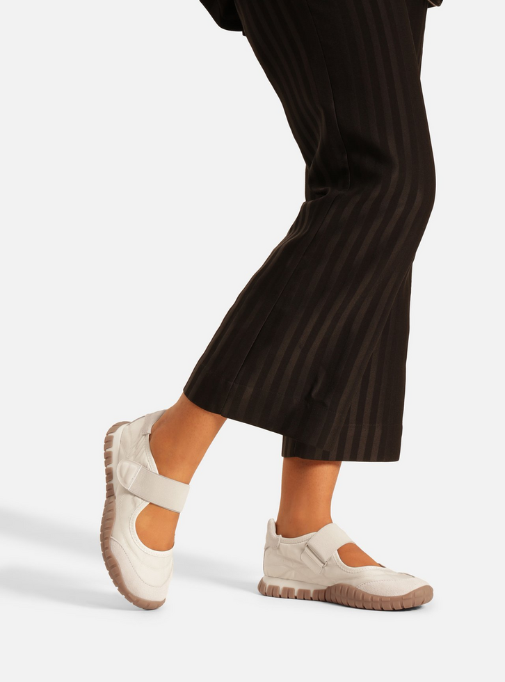 Tênis feminino branco em couro, suede e nylon. O sapato tem sola baixa, esportiva, emborrachada e bege, com relevo riscado e irregular. Traz cabedal aberto na parte superior do pé e costuras pesponto. Com formato arredondado na ponta, o tênis tem fecho em tira elástica larga com velcro e ponteira.